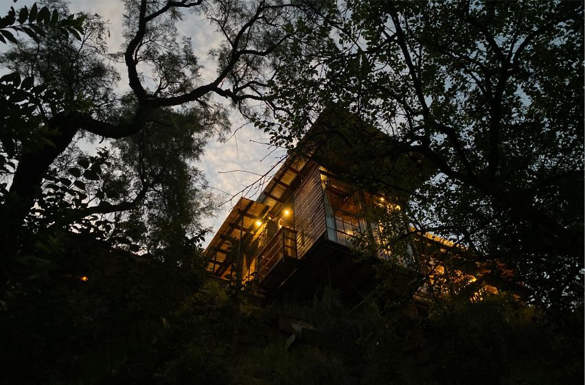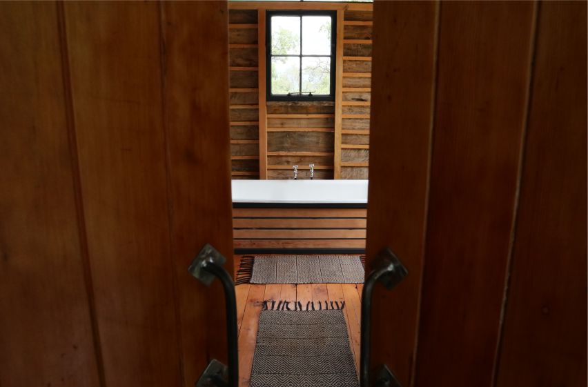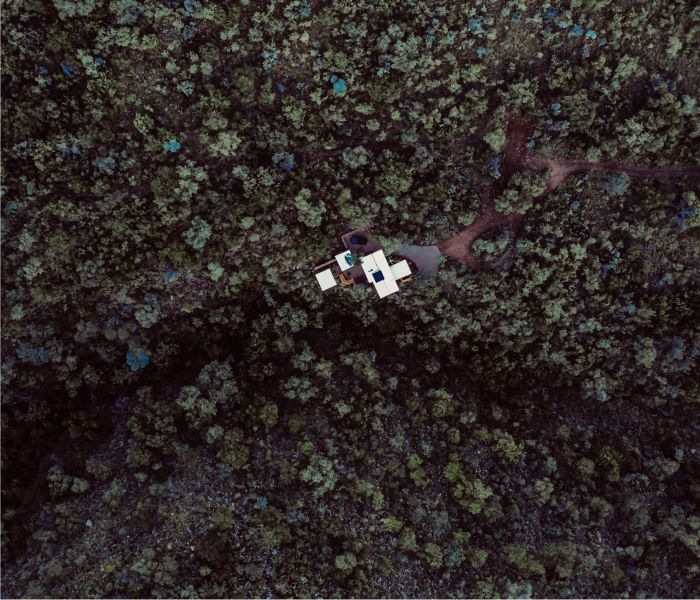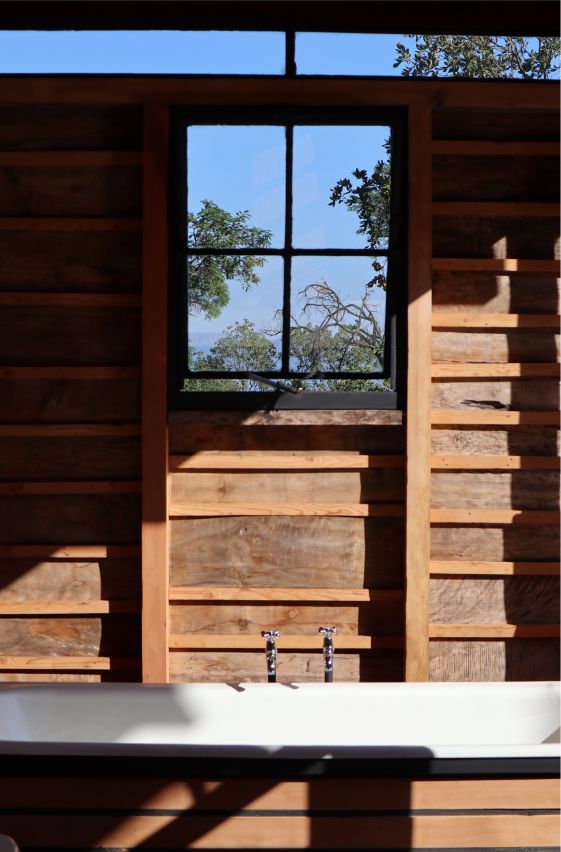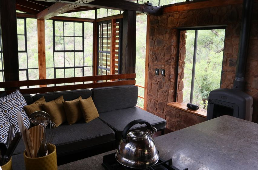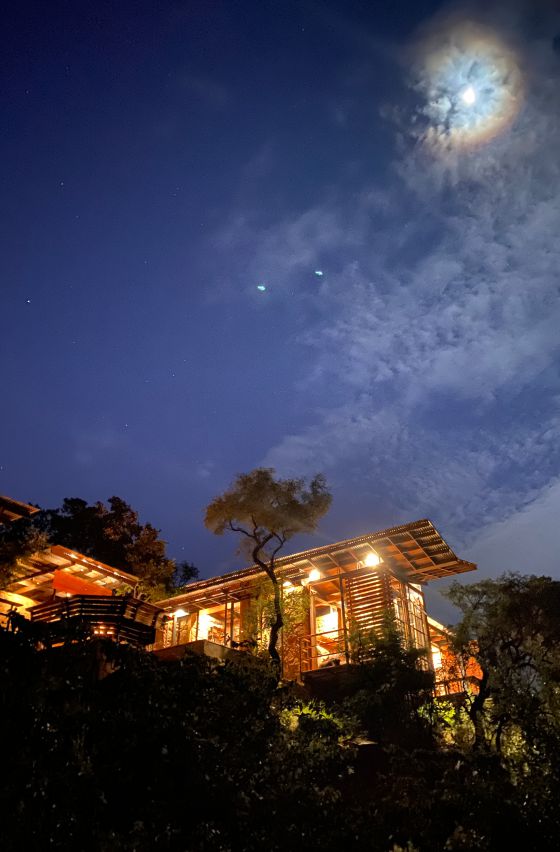 The cabin itself is open plan – generous sliding doors make way to the kitchen, lounge & wood-burner fireplace held by strong stone walls leading down to the bedroom. The bedroom is dream-like and floats out over the edge of the ravine as a glass box. The bed is a front row seat to watch the full moon rising from the silhouette of the mountain. The bathroom offers its own experience of magnificent views. The bathtub lends itself to a large sliding door opening to the outdoor shower. The cabin is light and airy whilst still allowing you to feel held within a cosy environment. Luna Cabin is devoted to its surroundings: where nature and dwelling become one – a unique experience which we are so excited to share.