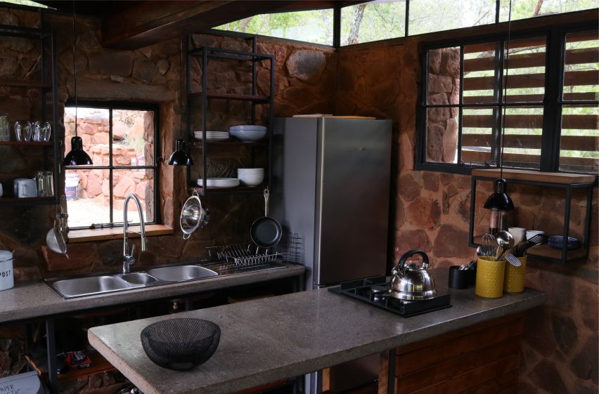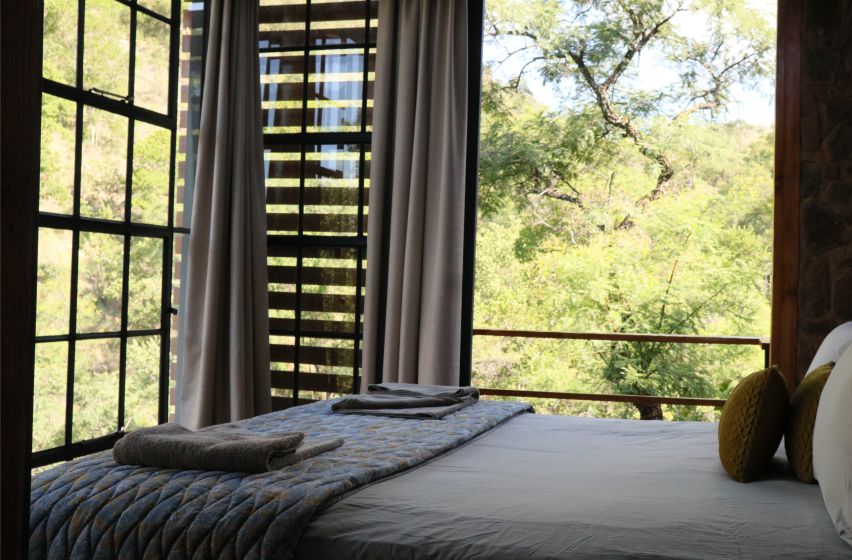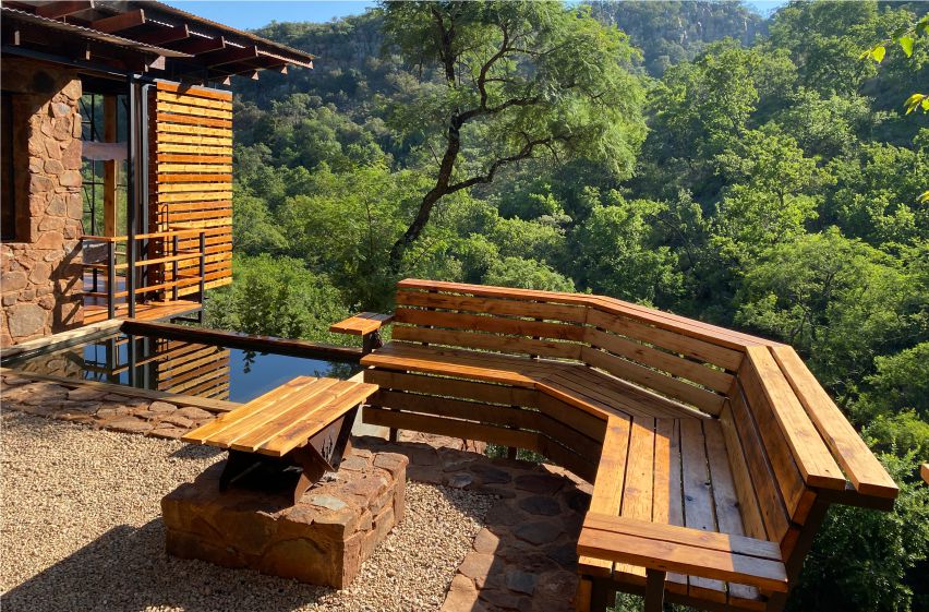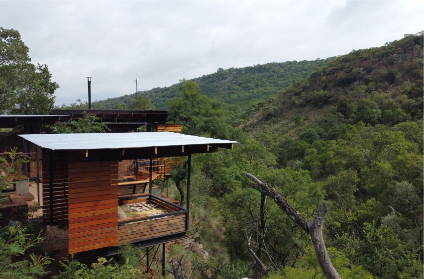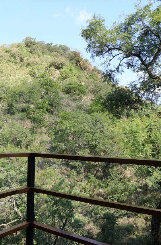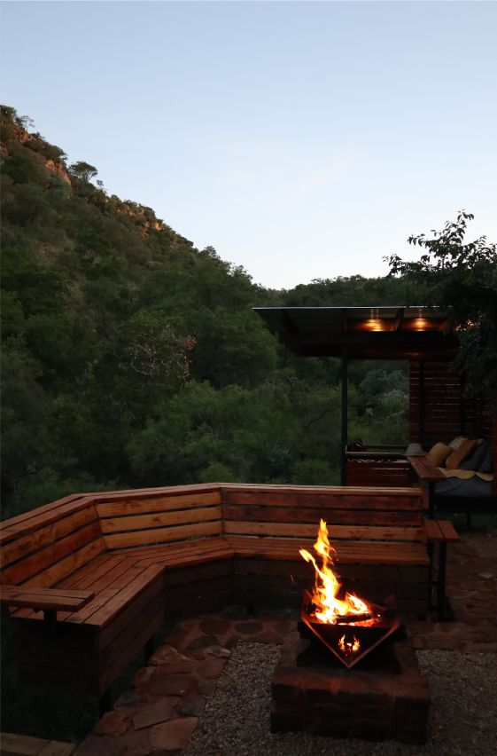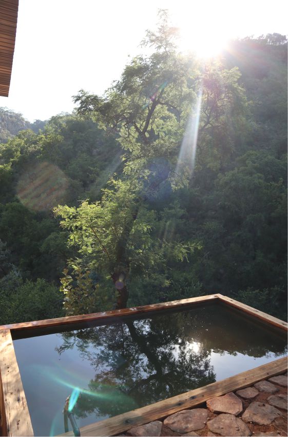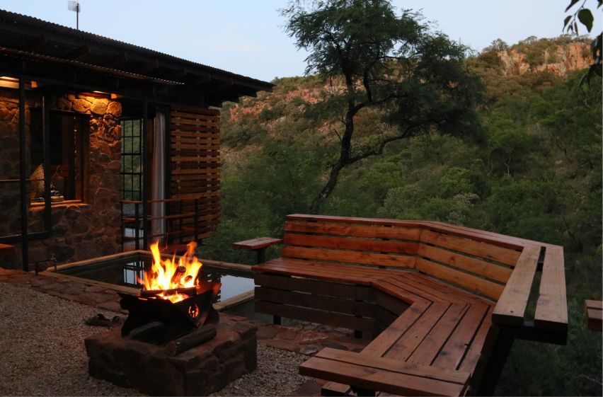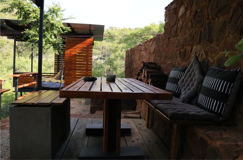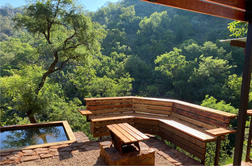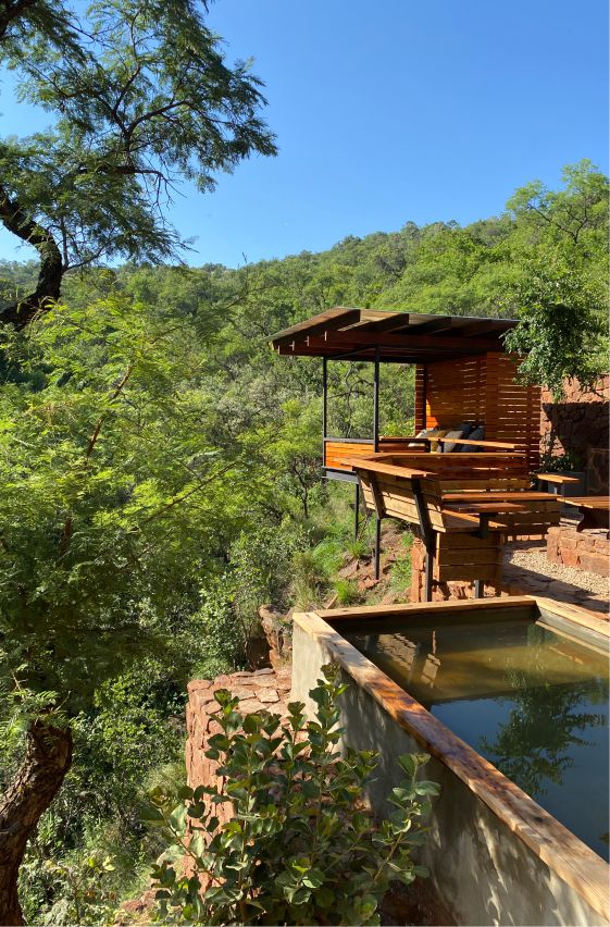 Situated on the edge of a secluded ravine, the Luna Cabin is meticulously woven onto the landscape. The cabin merges with the breathtaking natural surroundings of cliff faces and forest canopies above and below. It is an architectural celebration of spatial experiences with a reverence for the materials from which it is built. The spaces sequence themselves around a stone walled courtyard, each space giving different views and interactions to the encompassing nature: the daybed onlooking stunning views of the cliffs; the fire boma for the night’s starry skies; the raised outdoor covered dining veranda for all types of weather; the plunge pool which overlooks the koppie.